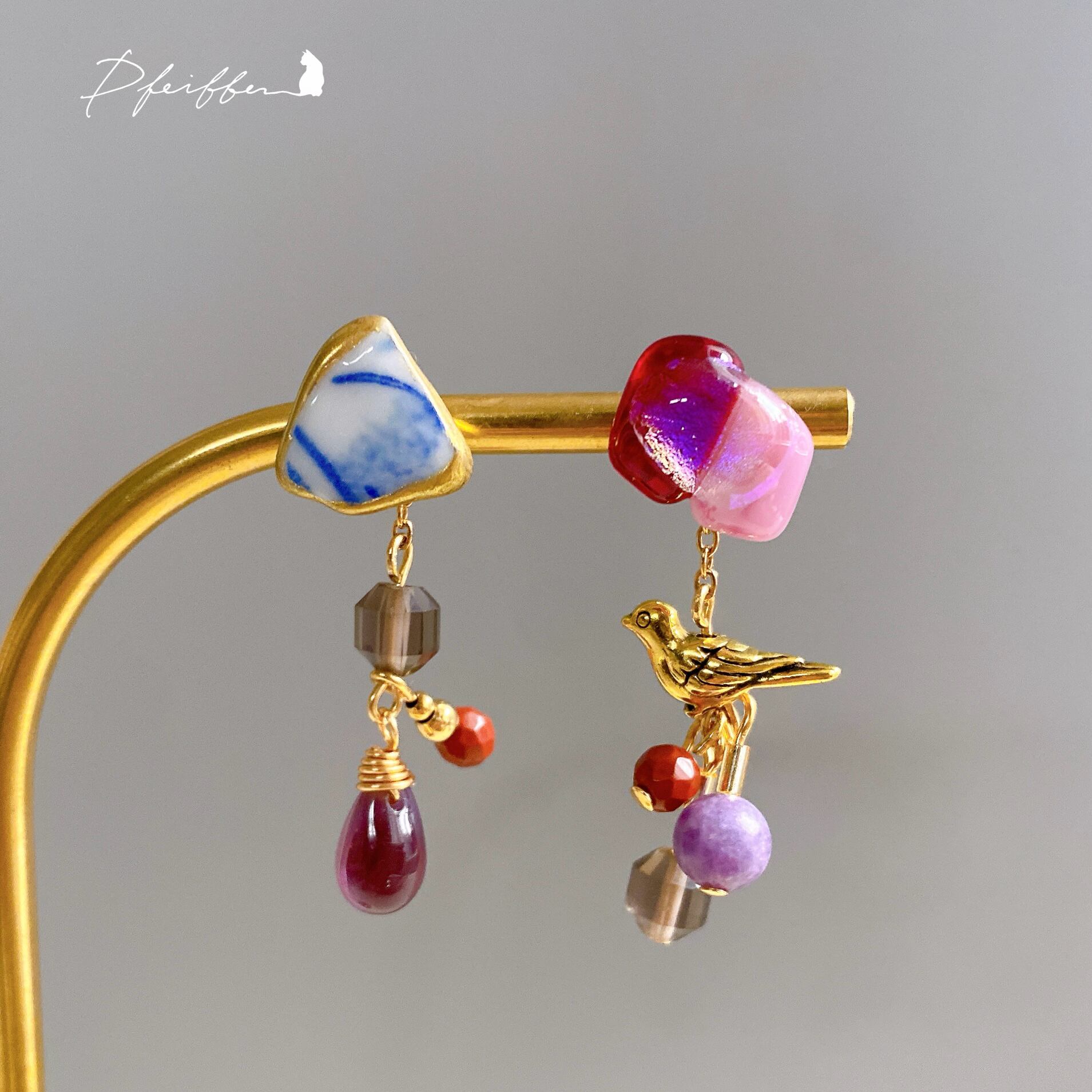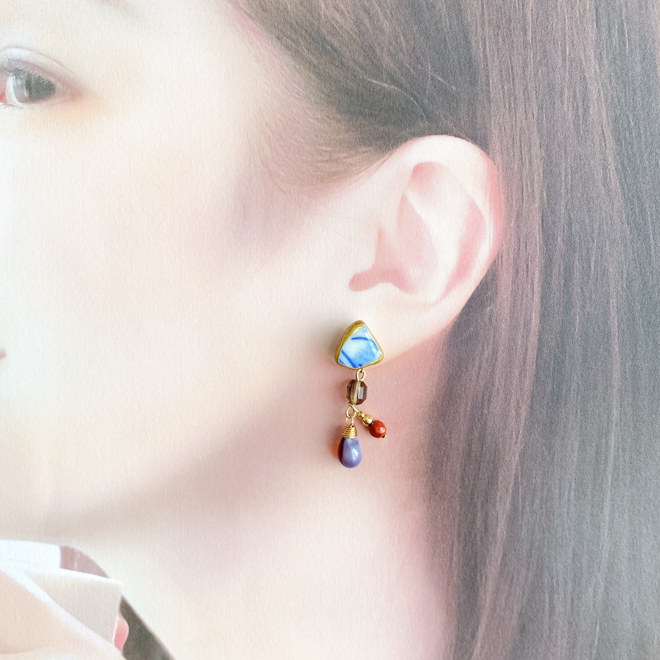 ピアス用に長さだしをしているパーツ(陶器部分と被る箇所)を取り外し、なるべくトップ写真のイメージに近づけるよう調整いたします。