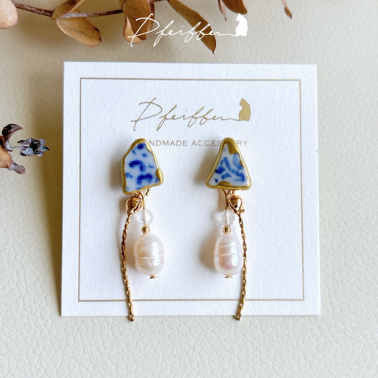 ピアス用に長さだしをしているパーツ(陶器部分と被る箇所)を取り外し、なるべくトップ写真のイメージに近づけるよう調整いたします。