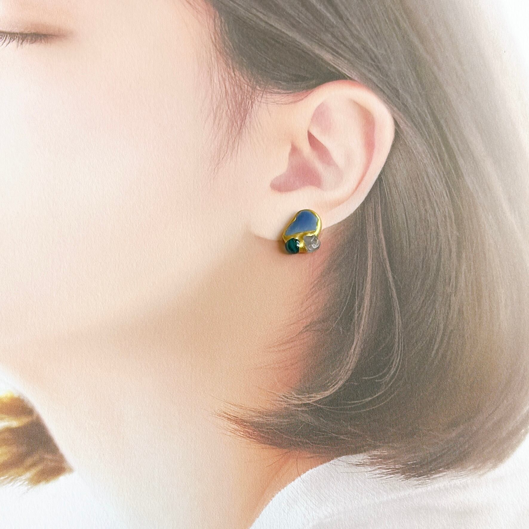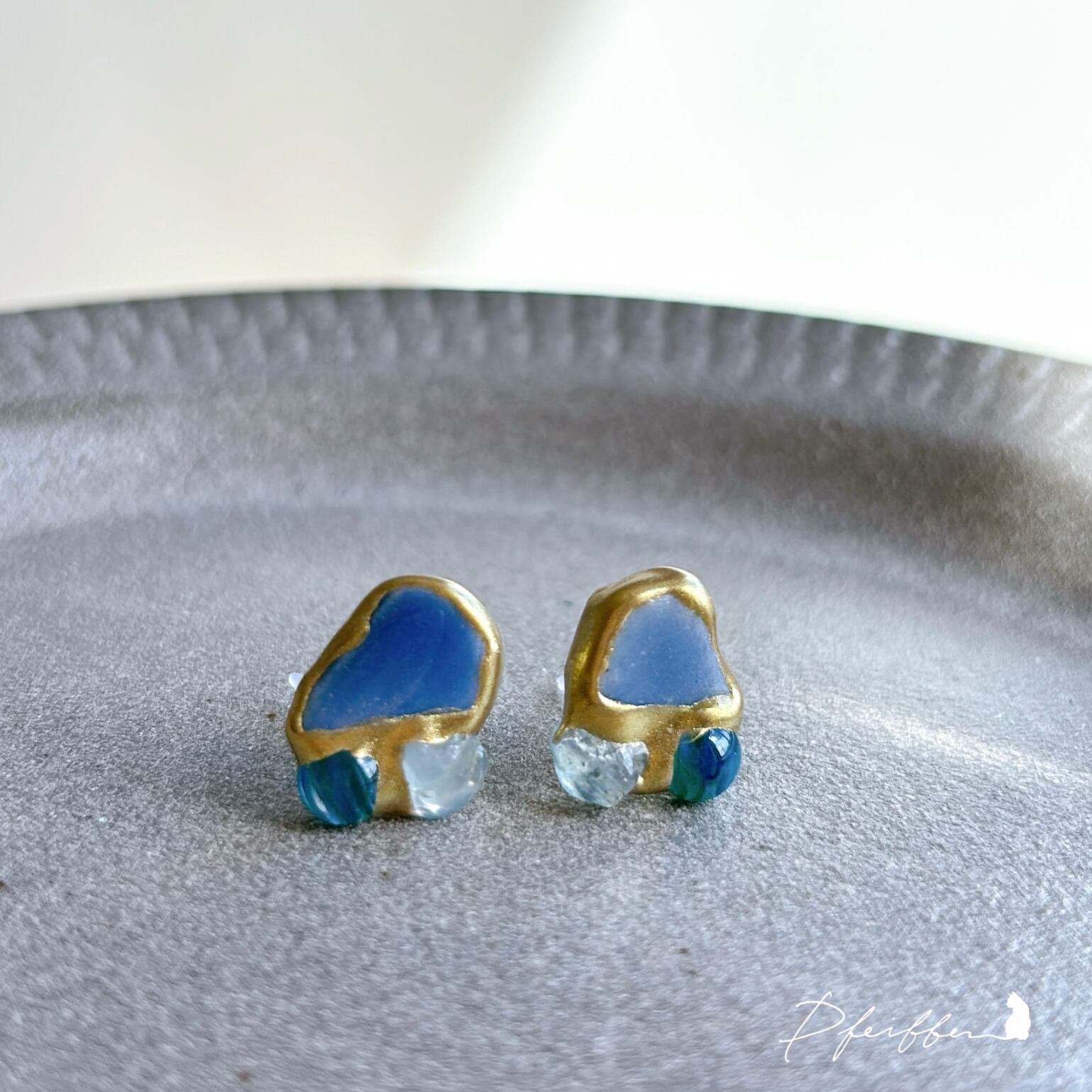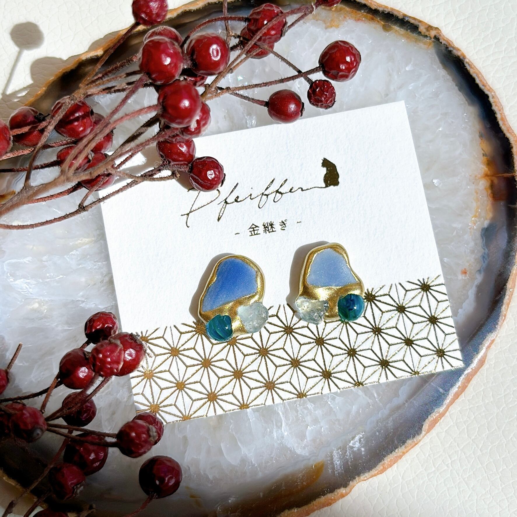 アクアマリンとガラスの煌めきと落ち着きのあるシー陶器が上品に耳元を飾ります。