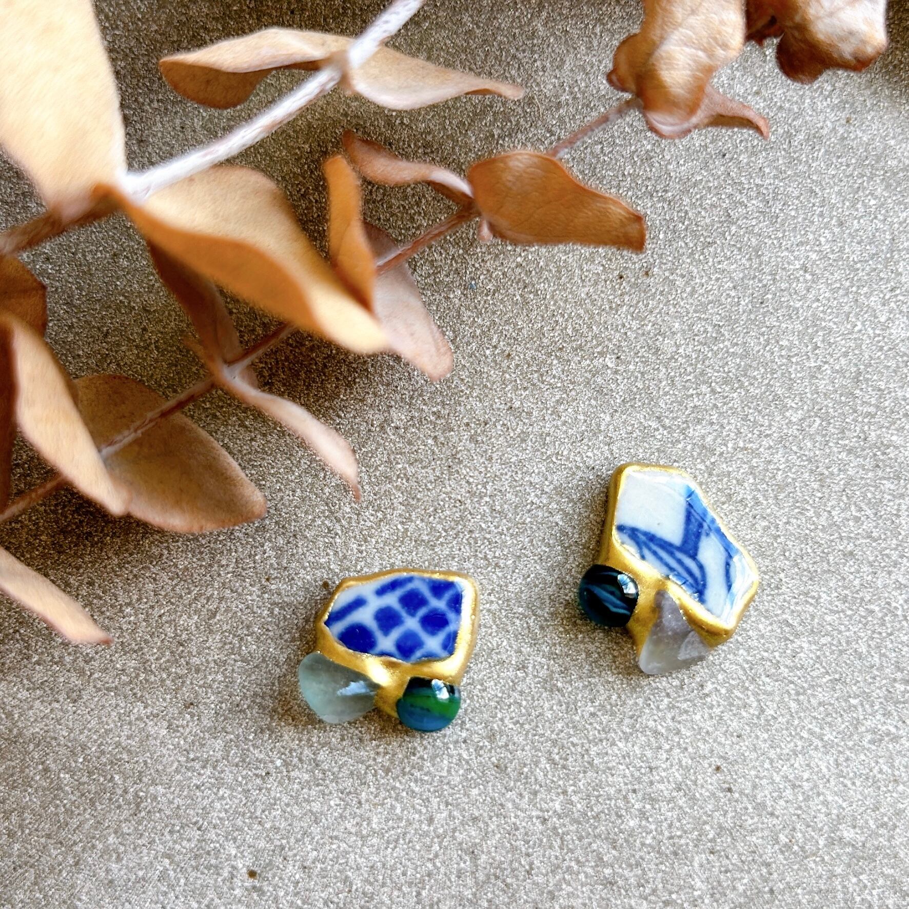 フローライトとガラスの煌めきと落ち着きのあるシー陶器が上品に耳元を飾ります。