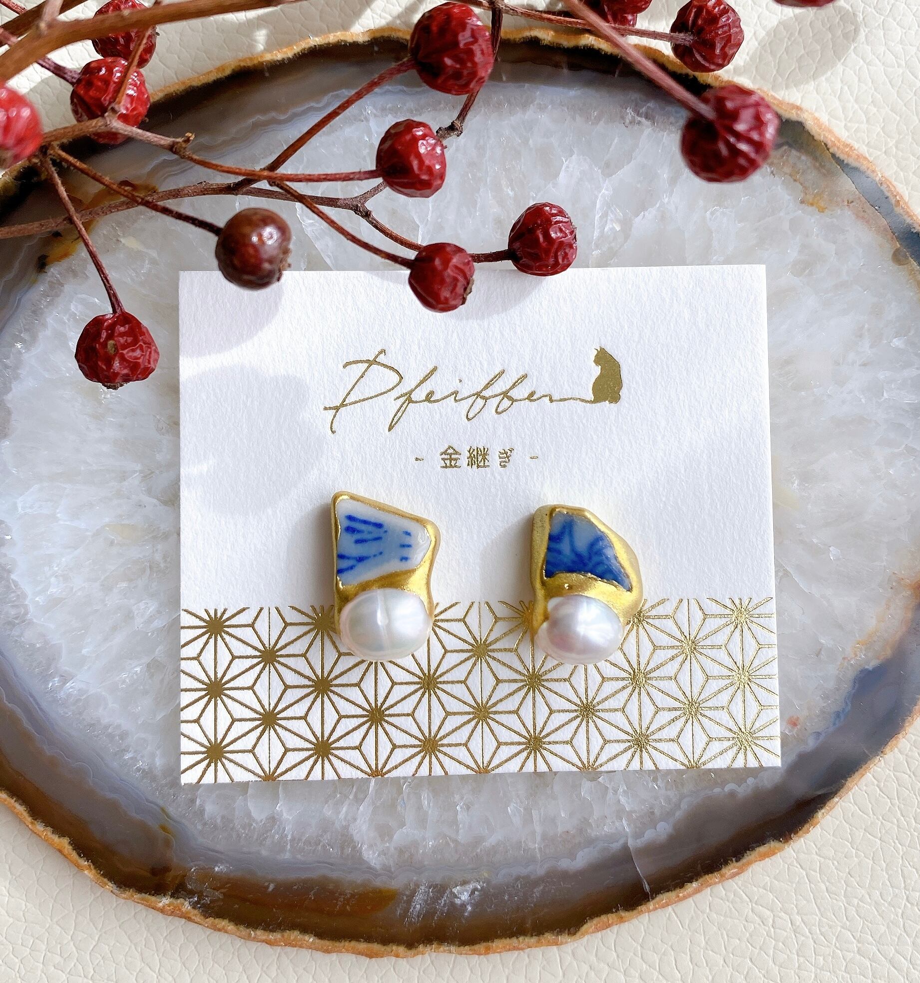 淡水パールの煌めきと落ち着きのあるシー陶器が上品に耳元を飾ります。