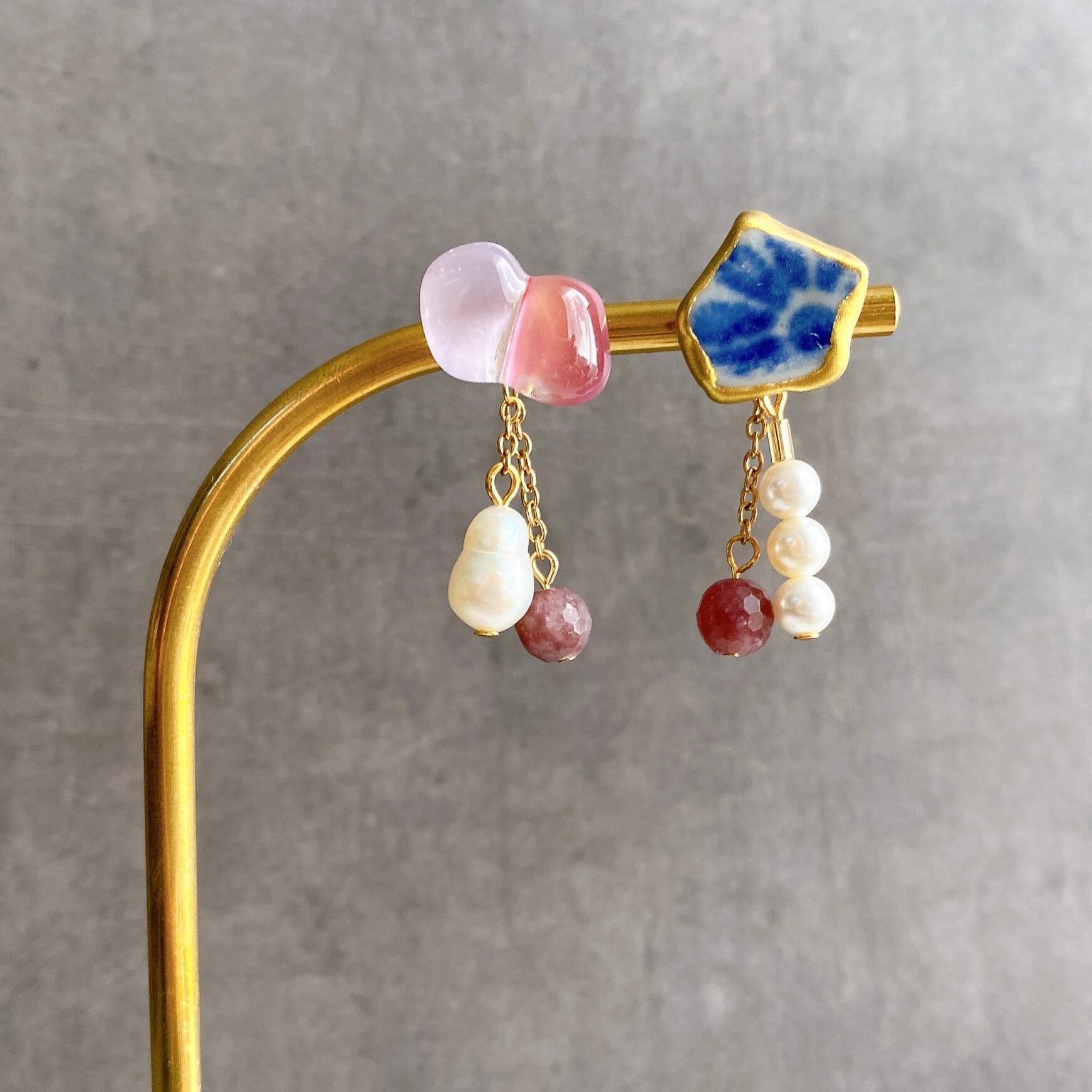 ピアス用に長さだしをしているパーツ(陶器部分と被る箇所)を取り外し、なるべくトップ写真のイメージに近づけるよう調整いたします。