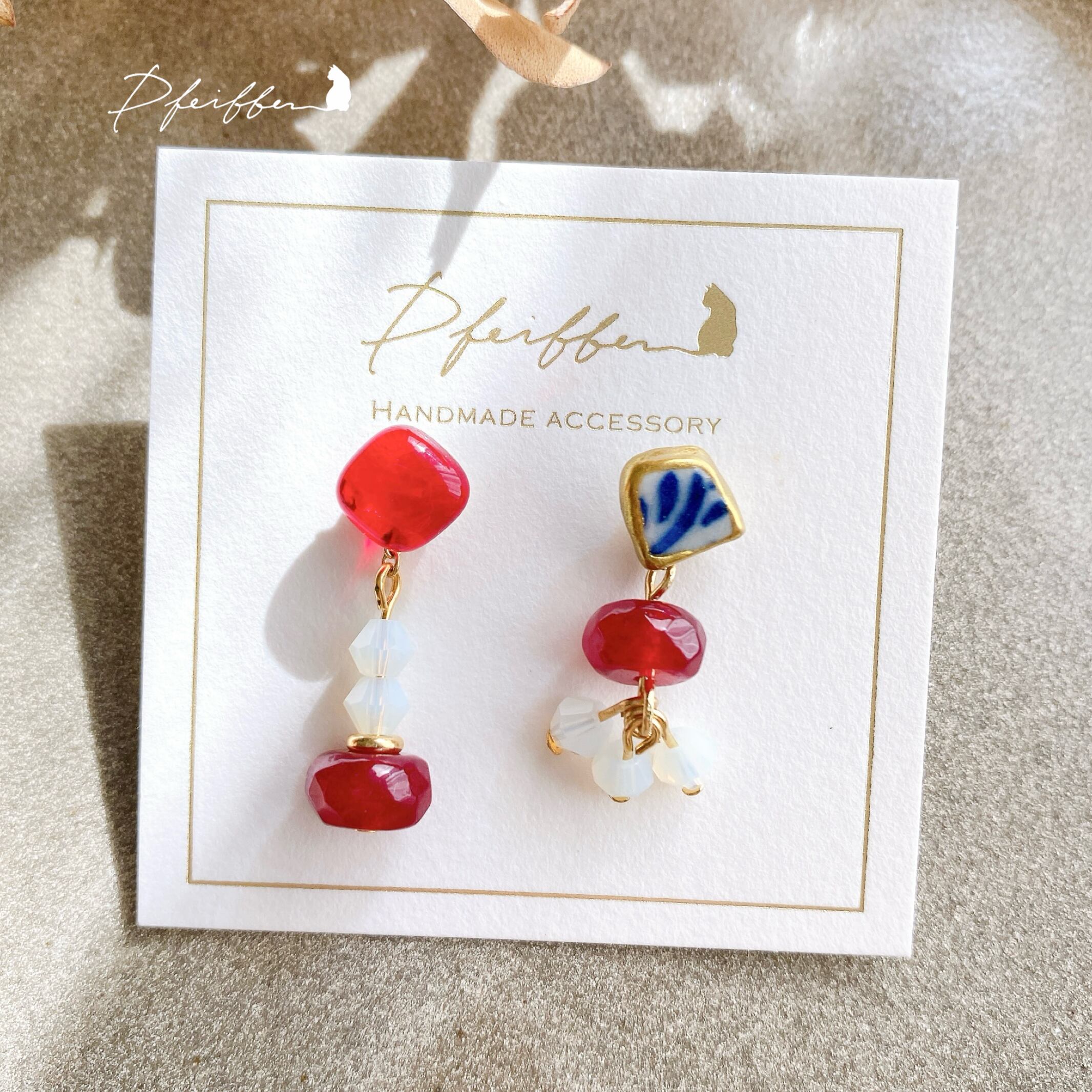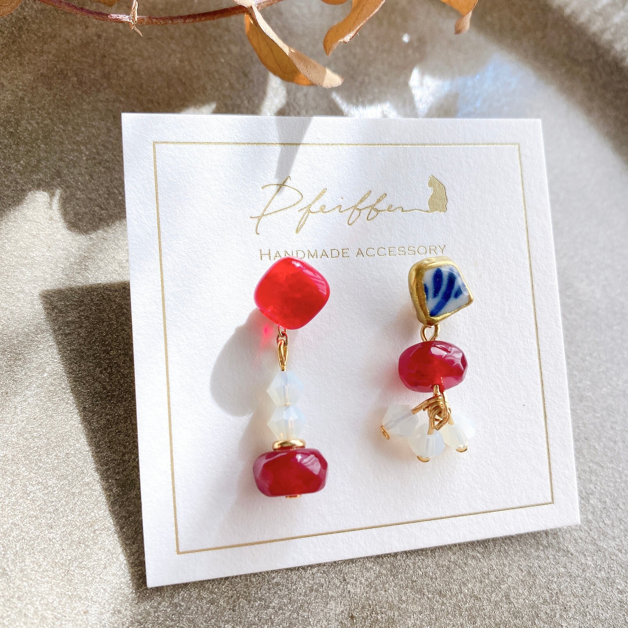 ピアス用に長さだしをしているパーツ(陶器部分と被る箇所)を取り外し、なるべくトップ写真のイメージに近づけるよう調整いたします。