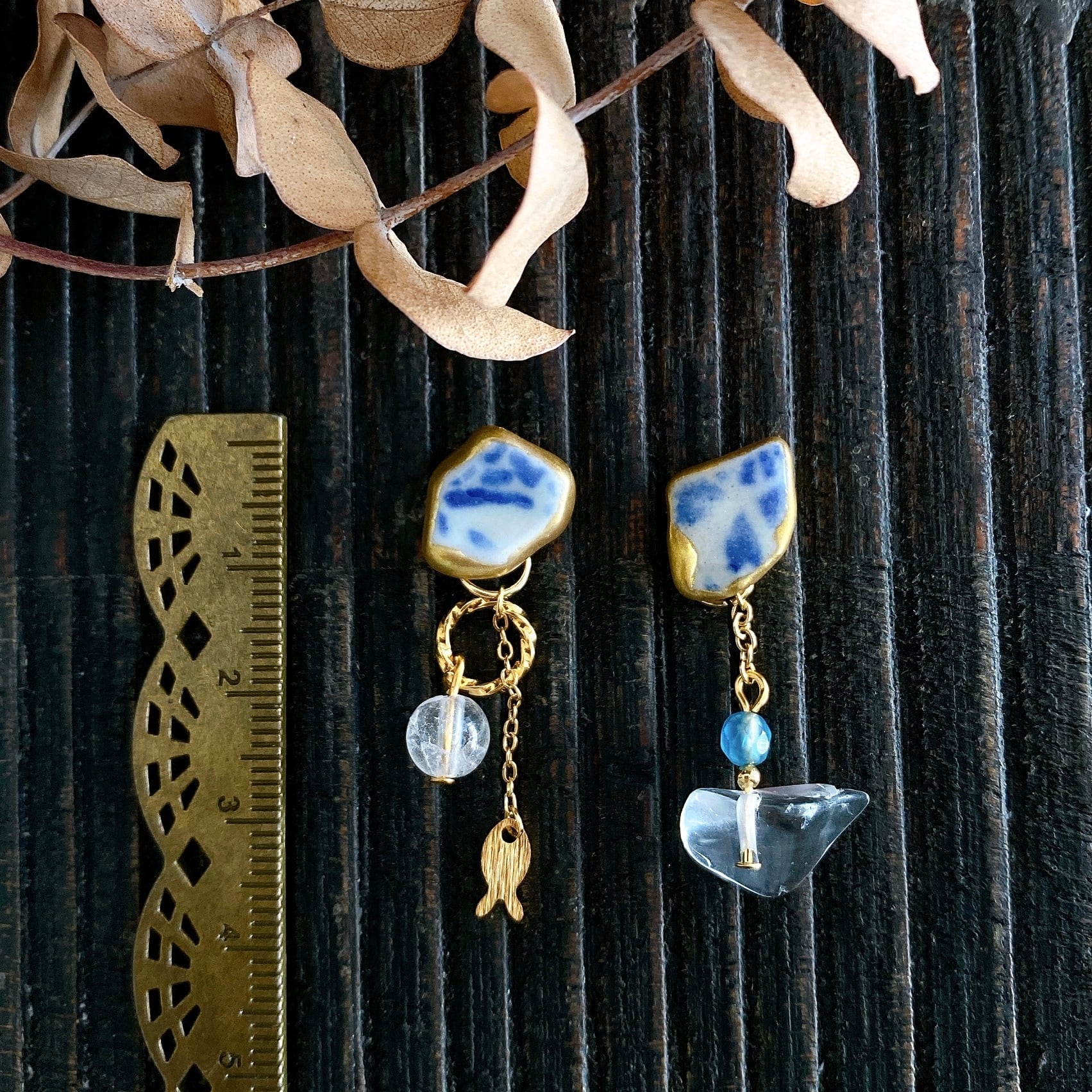 ピアス用に長さだしをしているパーツ(陶器部分と被る箇所)を取り外し、なるべくトップ写真のイメージに近づけるよう調整いたします。