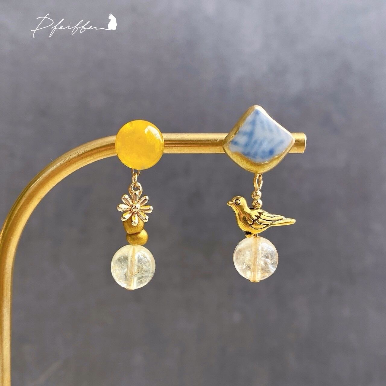 ガラス シトリン オペークビーズ K18GPチャーム(花)合金鳥ビーズ
