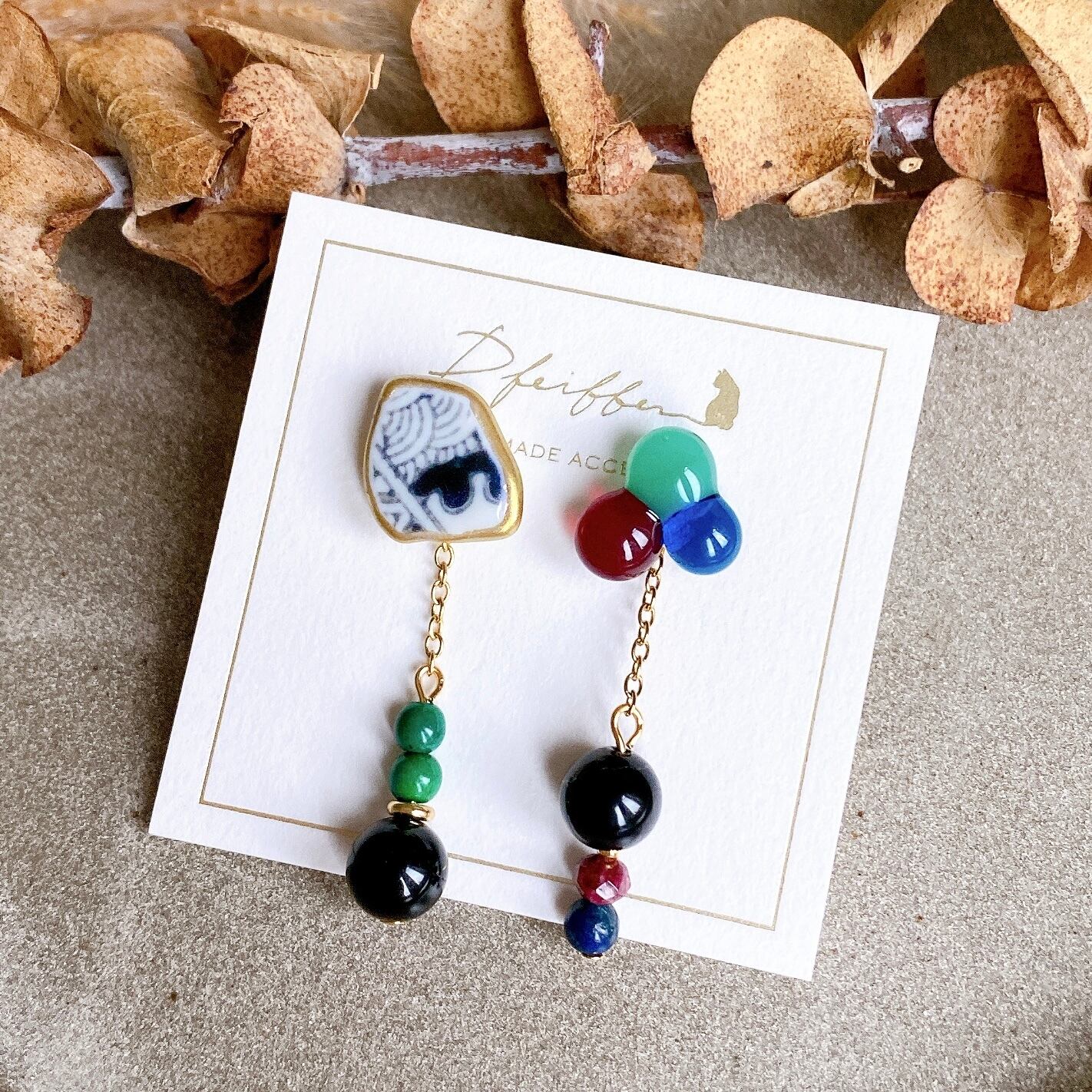 【海の遊び心】2way シー陶器×オニキス×クリソコラ×ラピスラズリ ピアス/イヤリング