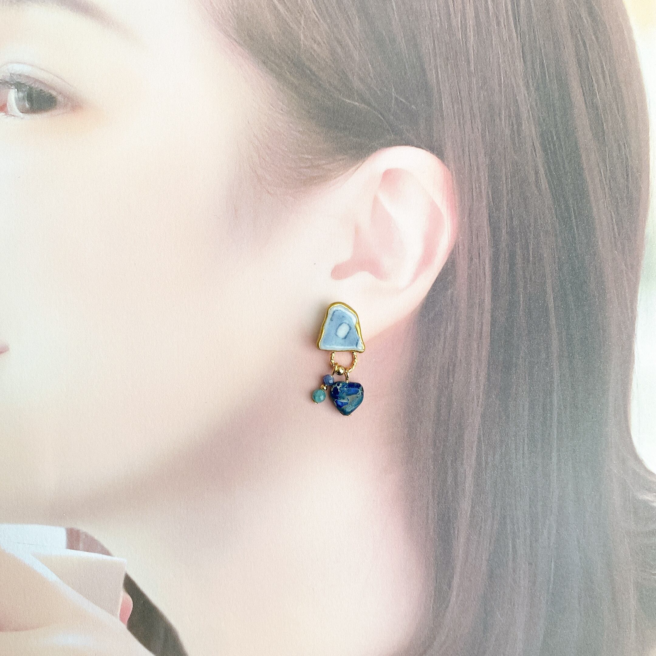 ピアス用に長さだしをしているパーツ(陶器部分と被る箇所)を取り外し、なるべくトップ写真のイメージに近づけるよう調整いたします。