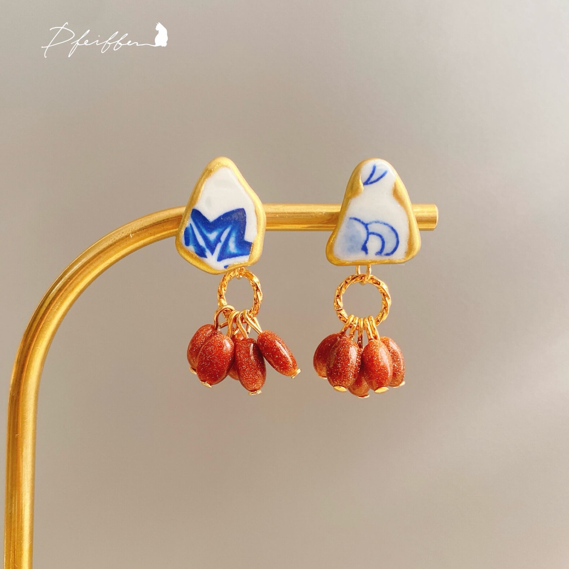 ピアス用に長さだしをしているパーツ(陶器部分と被る箇所)を取り外し、なるべくトップ写真のイメージに近づけるよう調整いたします。