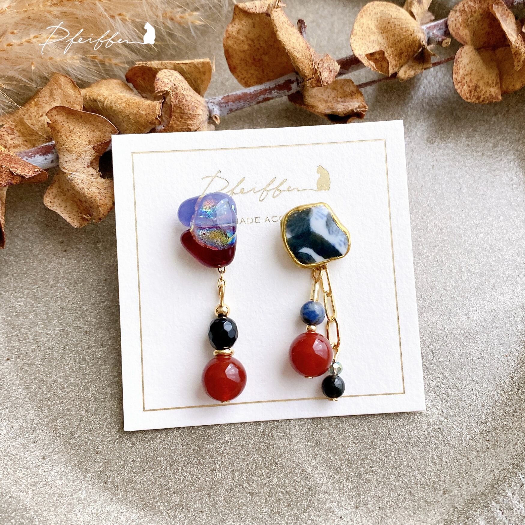 【海の遊び心】2way シー陶器×カーネリアン×ブラックトルマリン ピアス/イヤリング