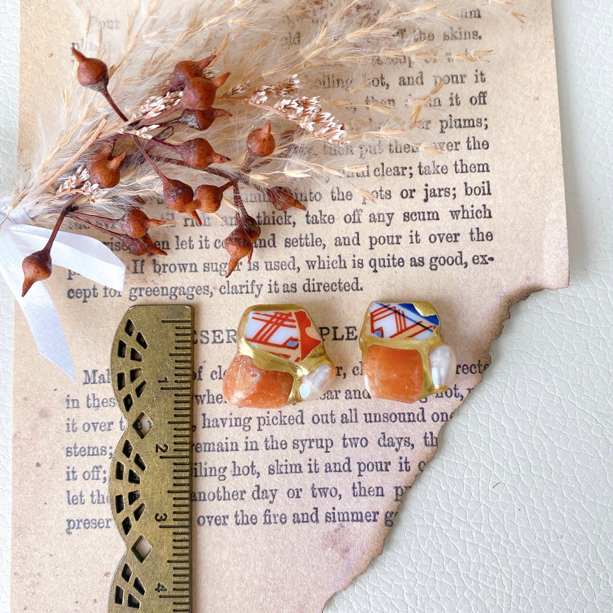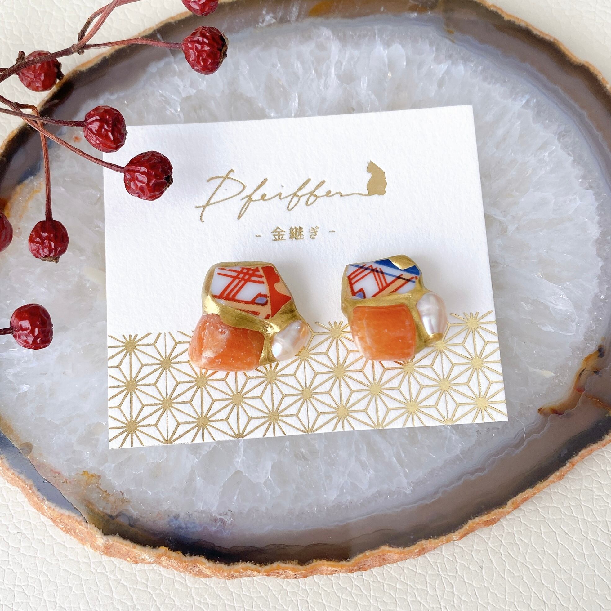 【日本の焼き物 】 有田焼とオレンジアベンチュリン 金継ぎピアス/イヤリング