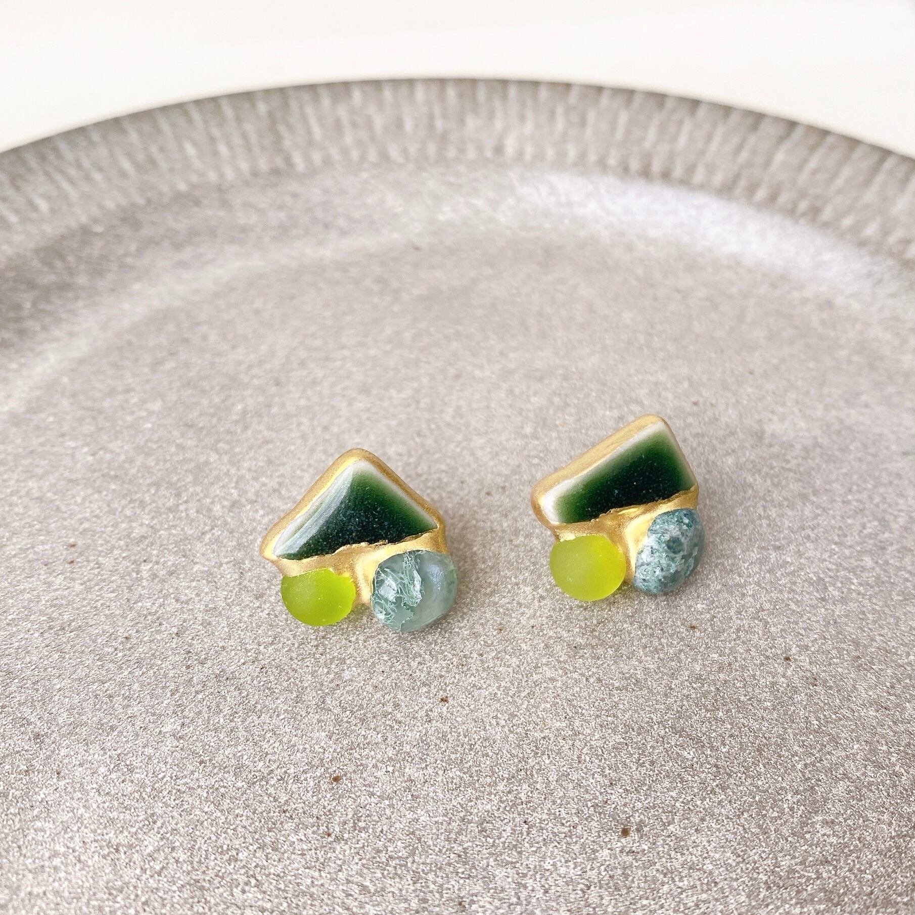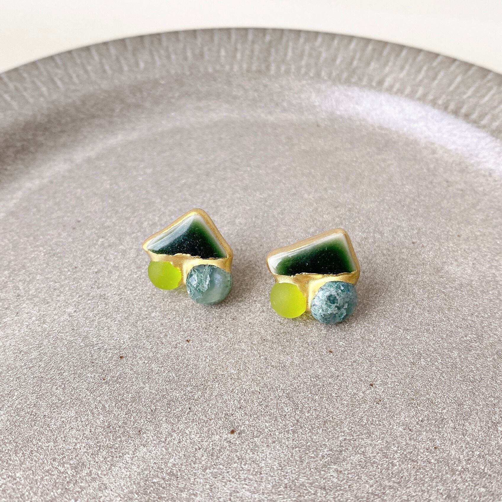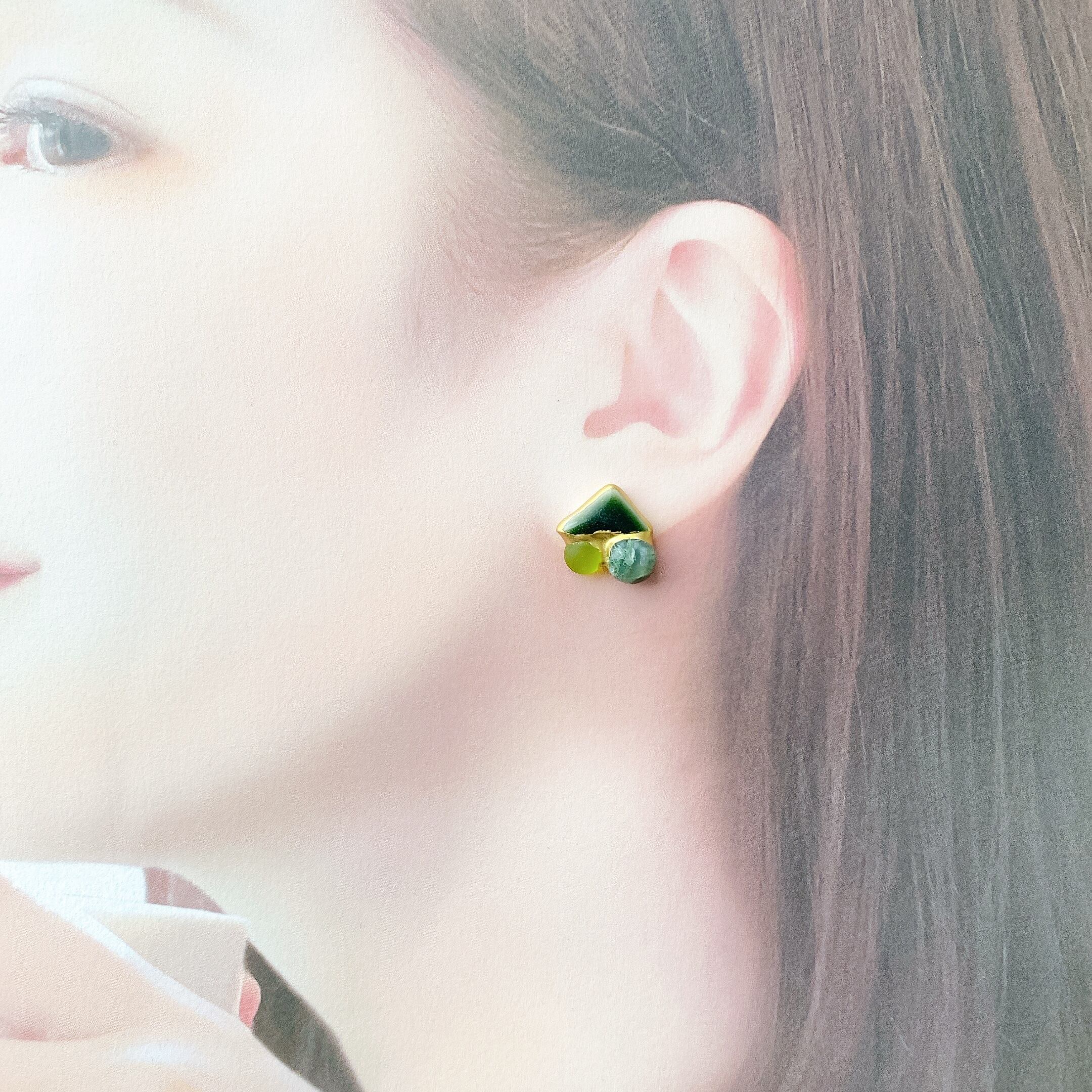 華やかな天然石と落ち着きのあるシー陶器が上品に耳元を飾ります。