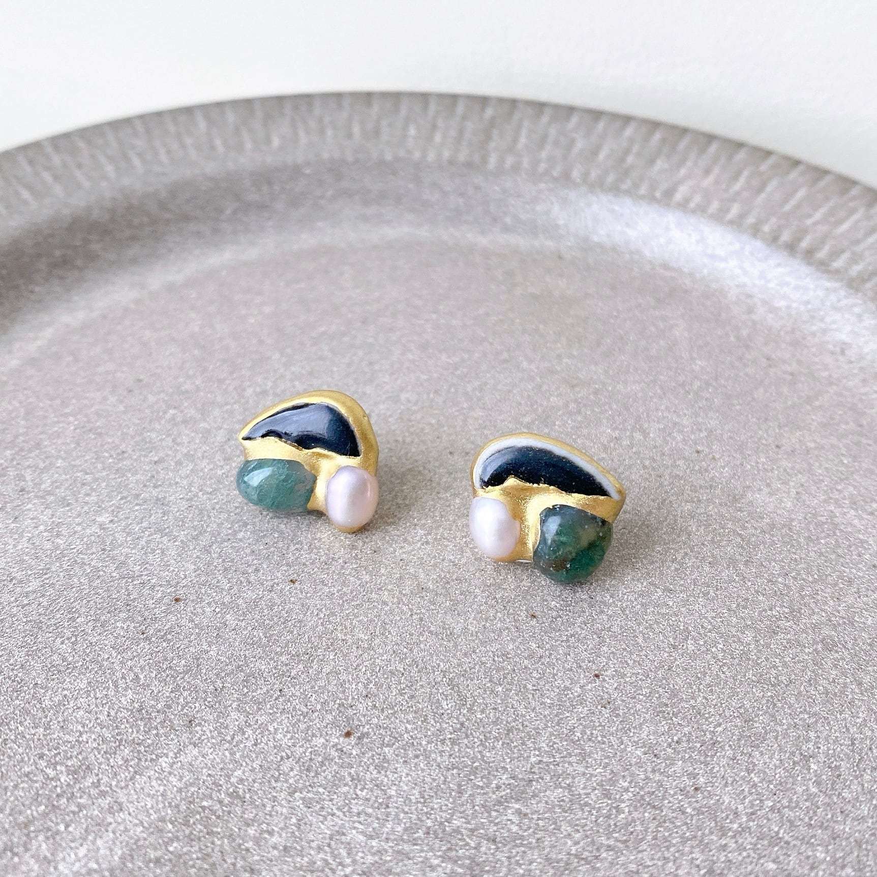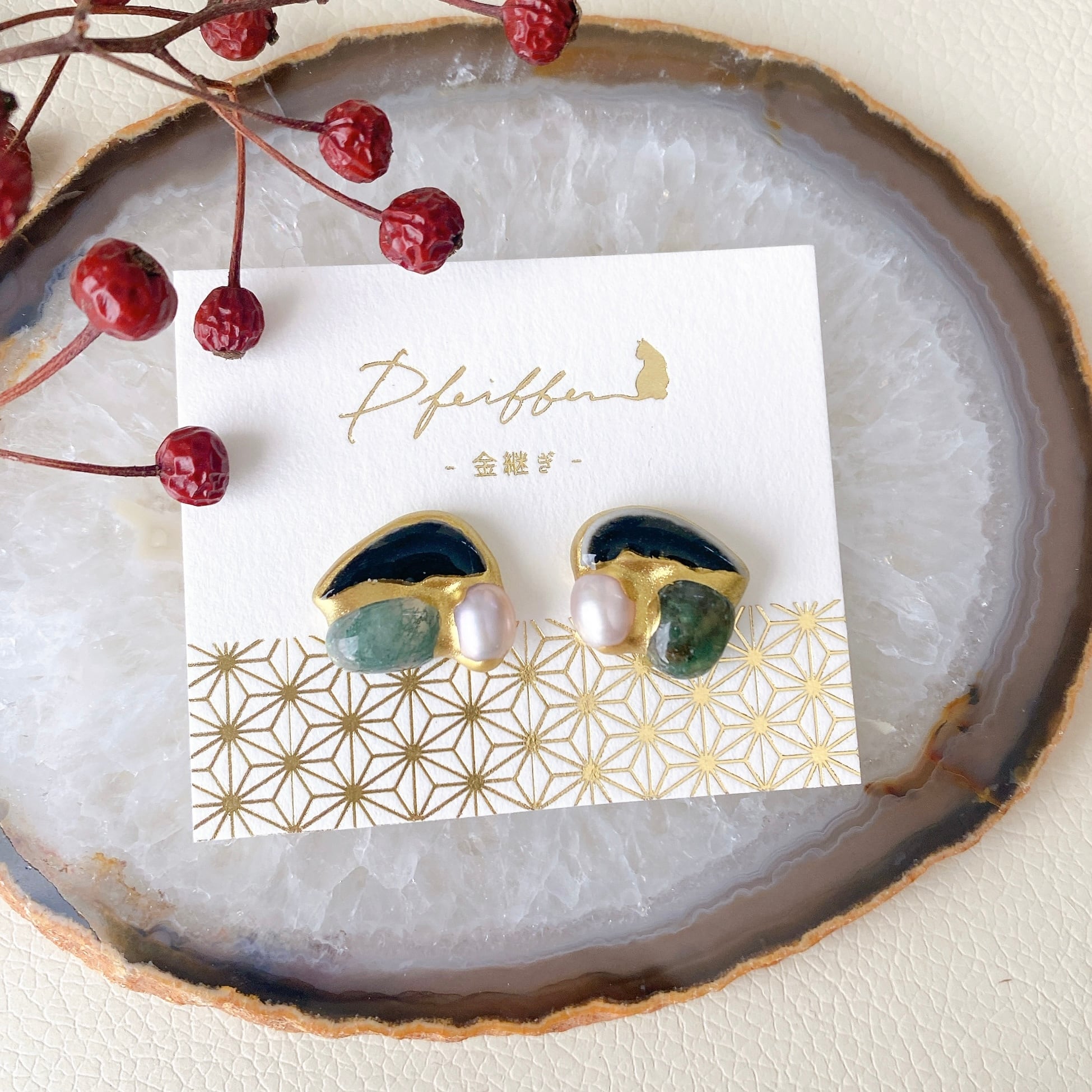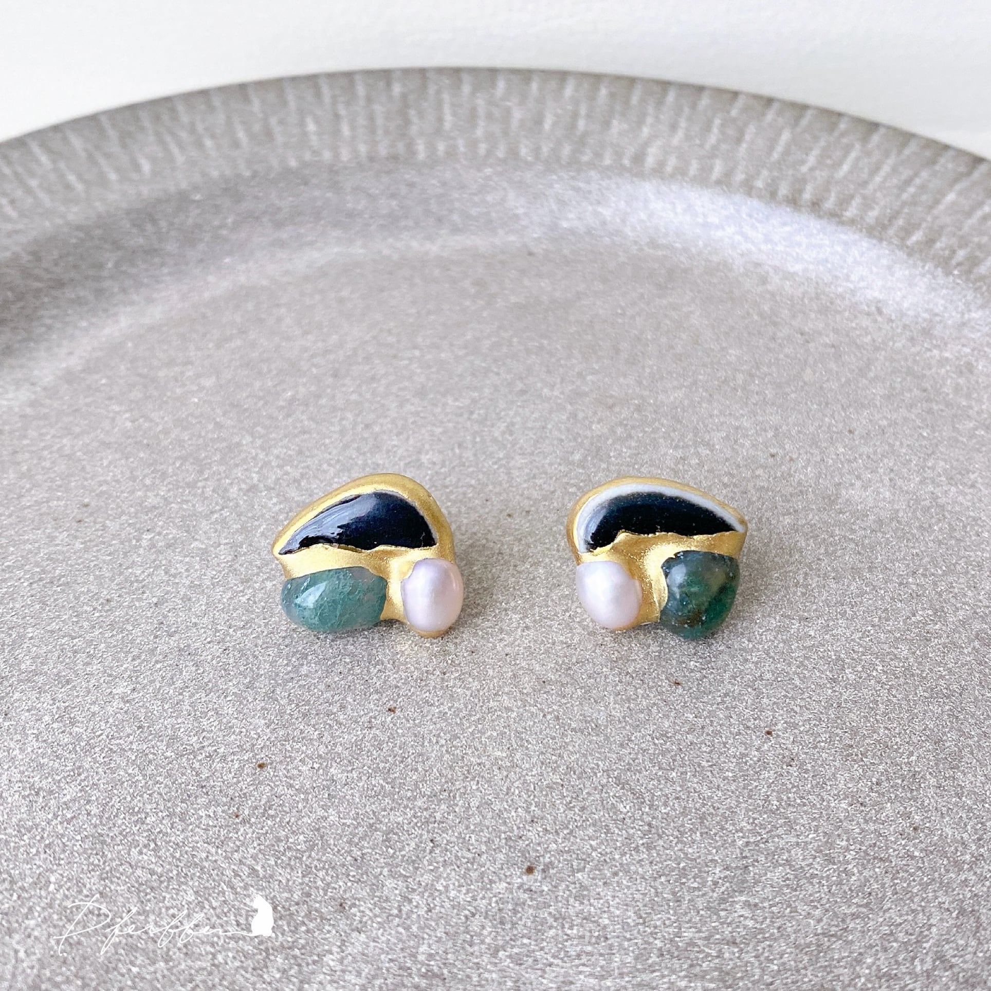 華やかな天然石と落ち着きのあるシー陶器が上品に耳元を飾ります。