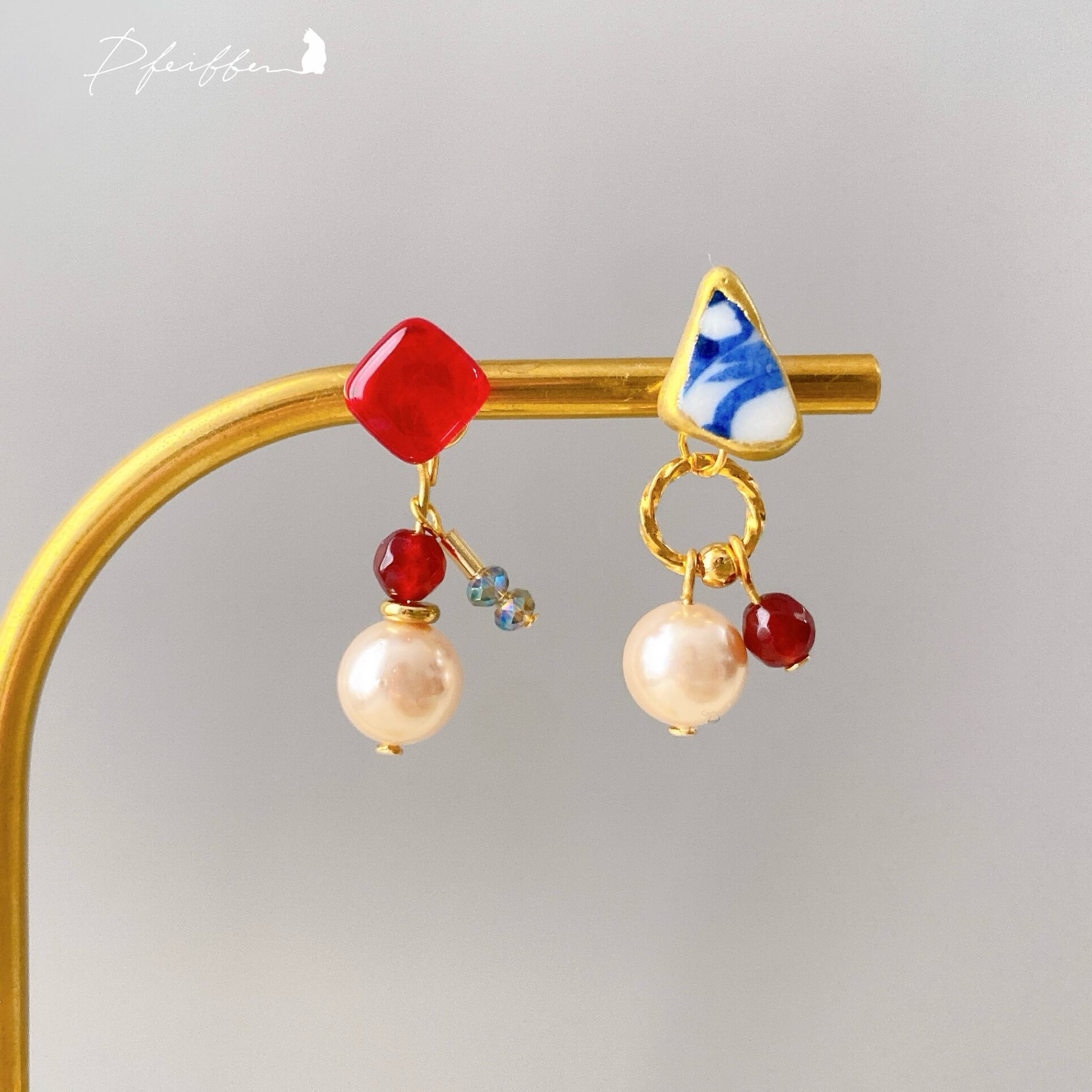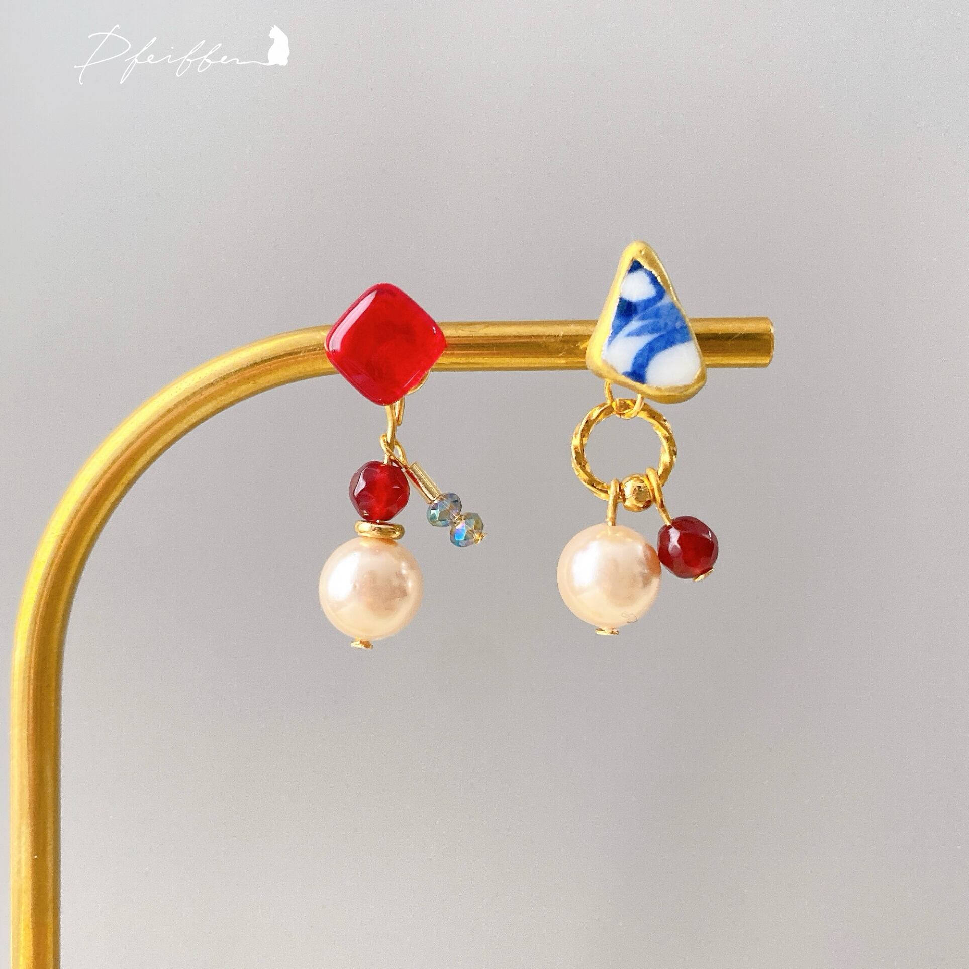 【海の遊び心】2way シー陶器×ジェイド×シェルパール ピアス/イヤリング