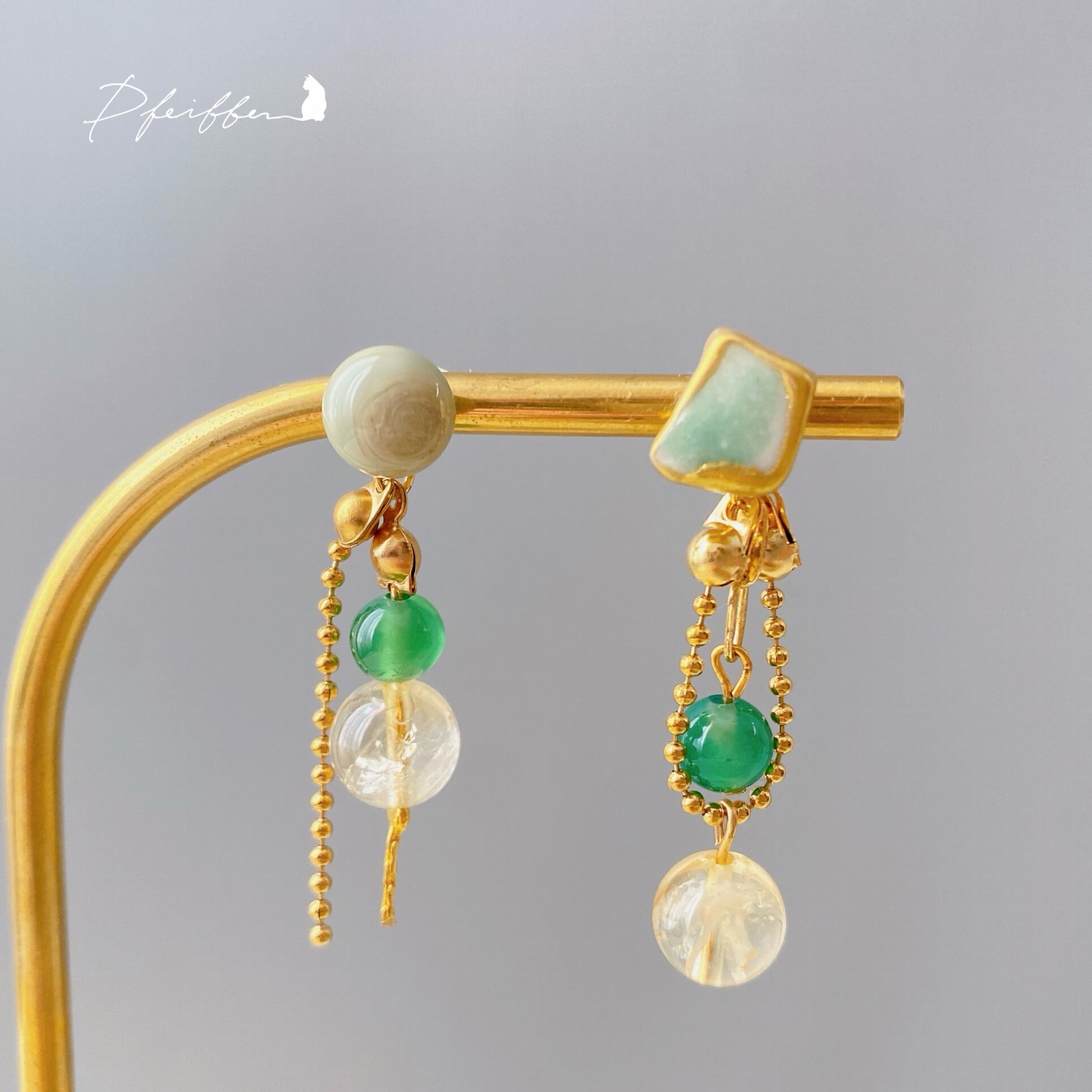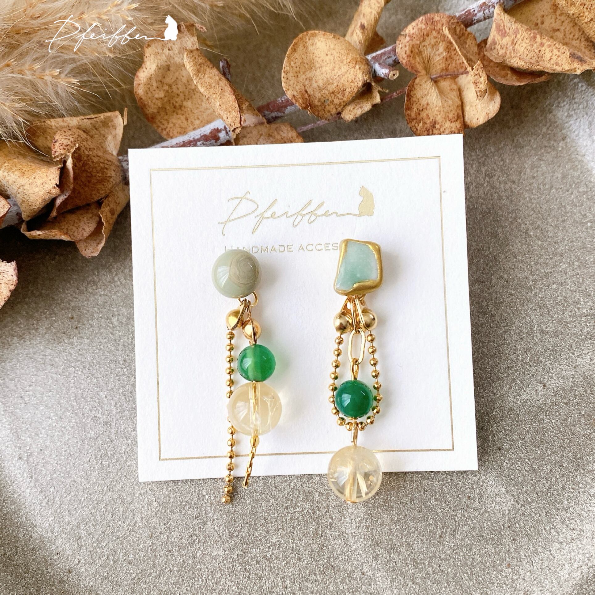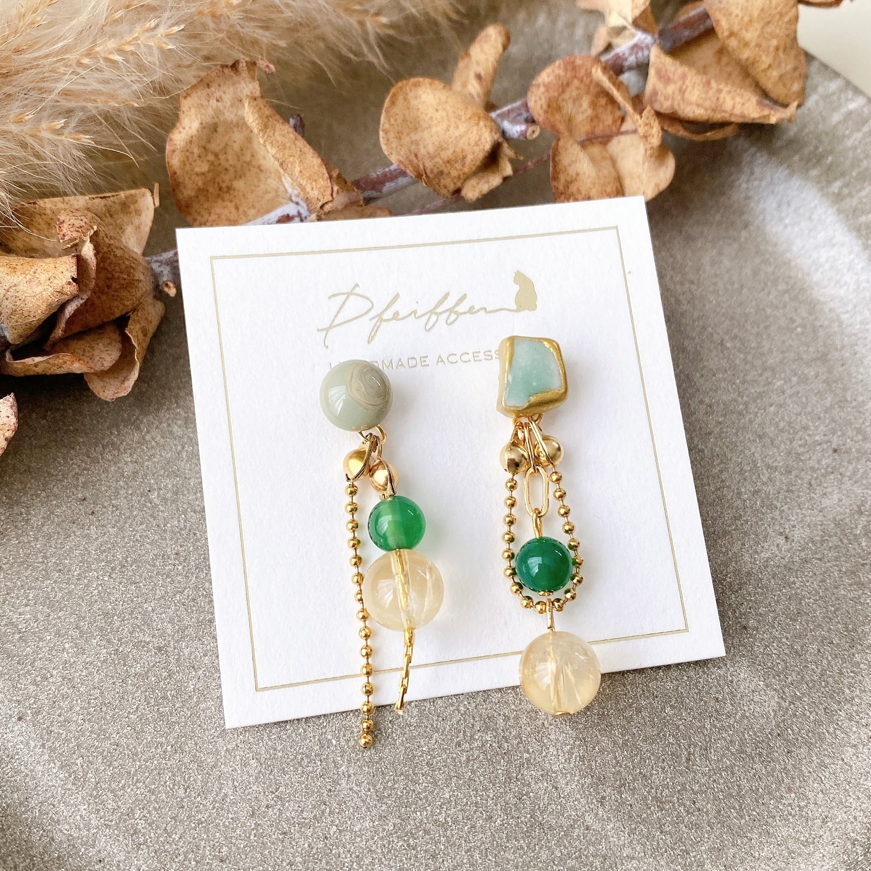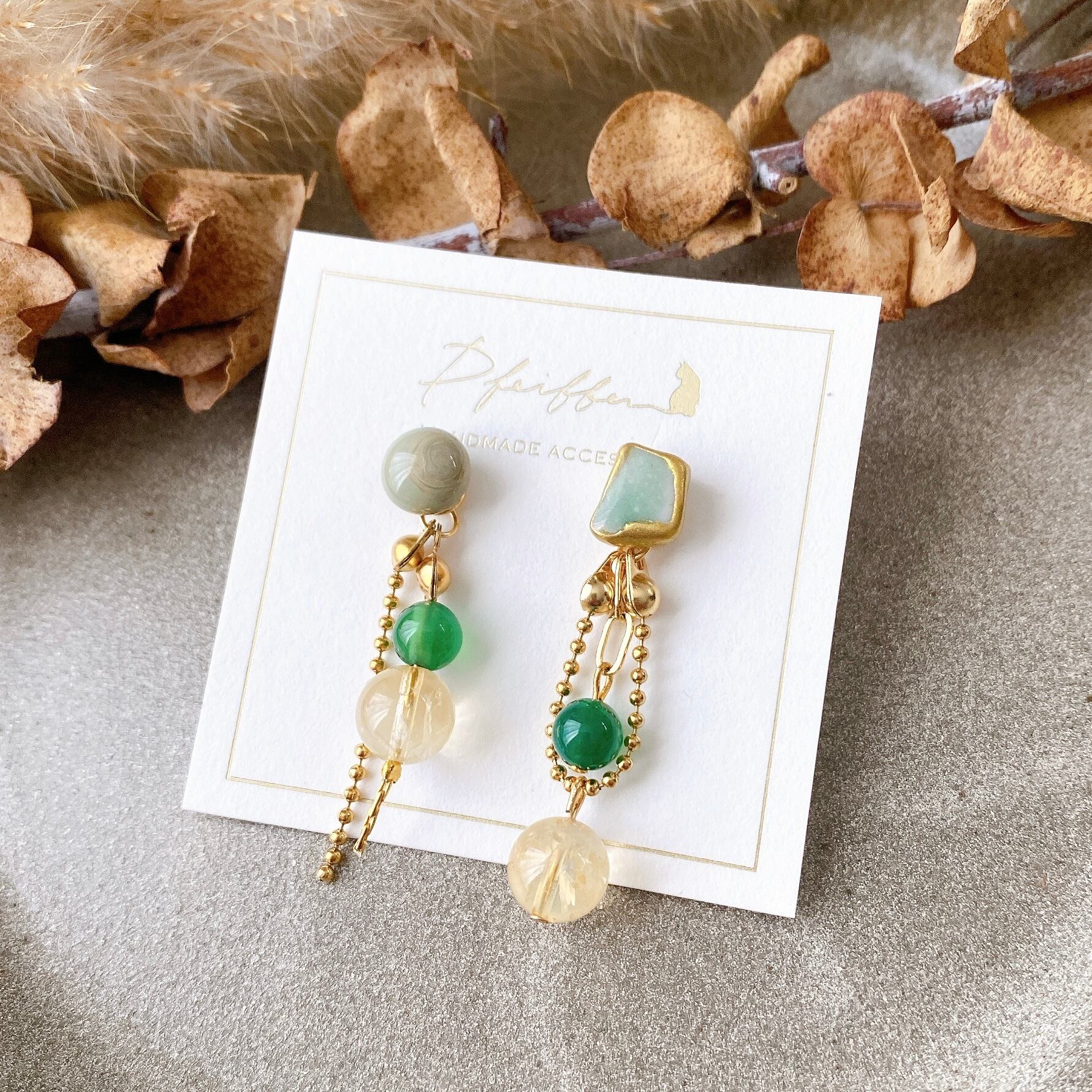 シー陶器と天然石を使い、個性豊かにデザインした一点物シリーズ。