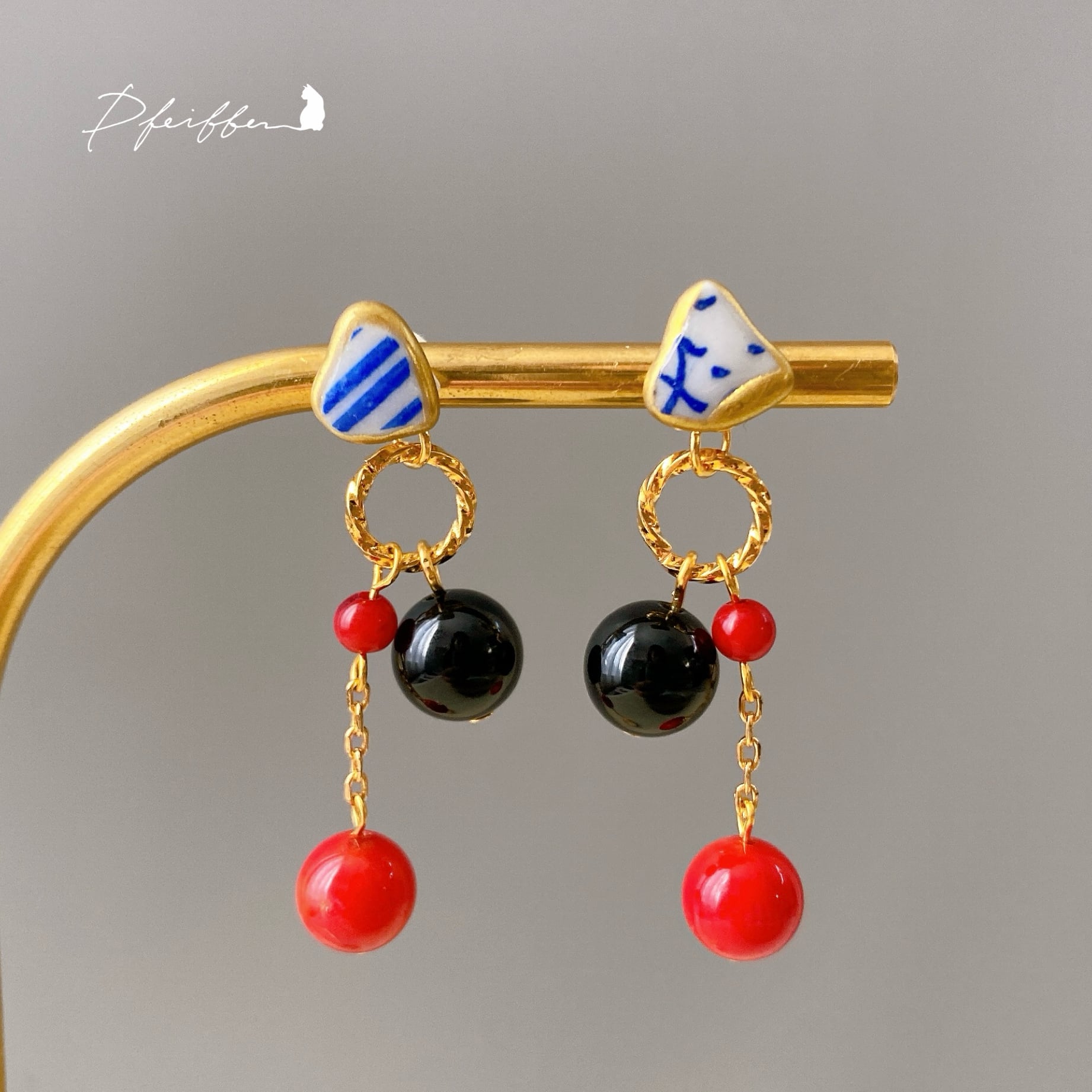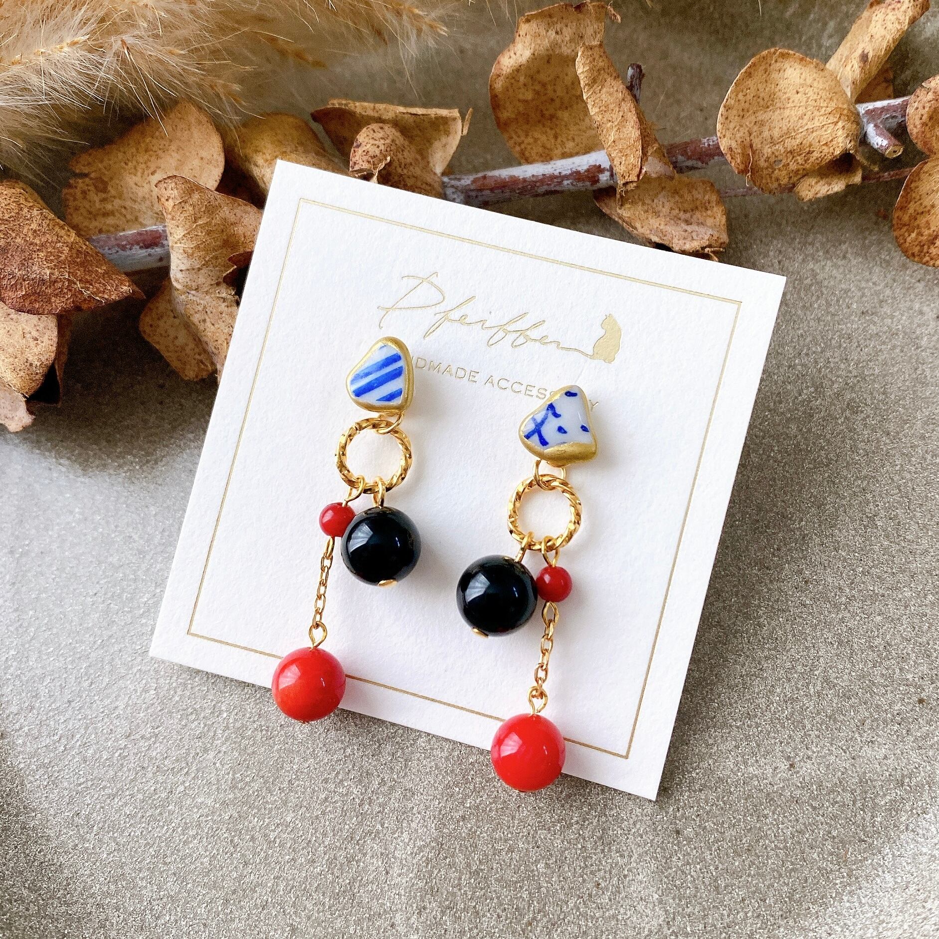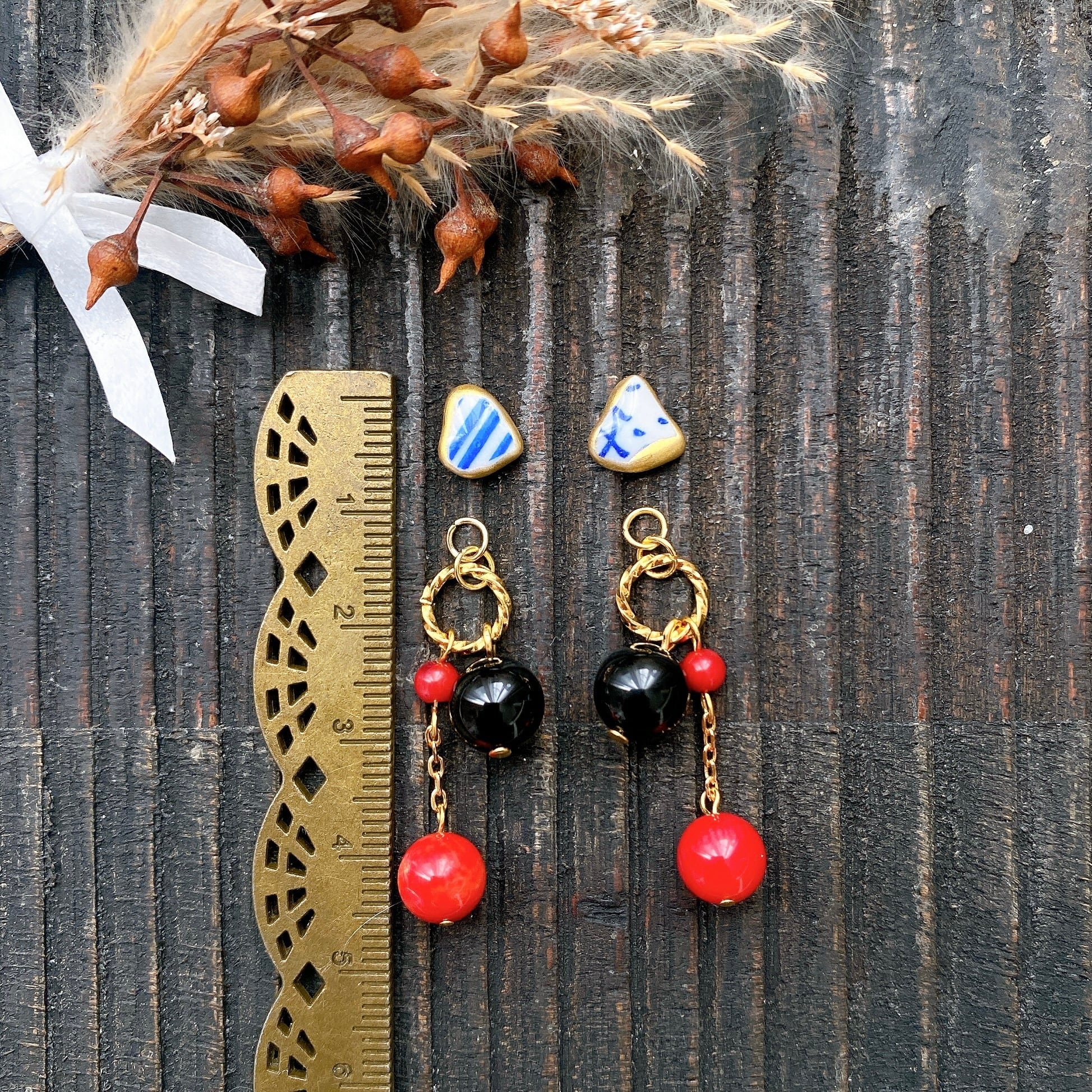 ピアス用に長さだしをしているパーツ(陶器部分と被る箇所)を取り外し、なるべくトップ写真のイメージに近づけるよう調整いたします。