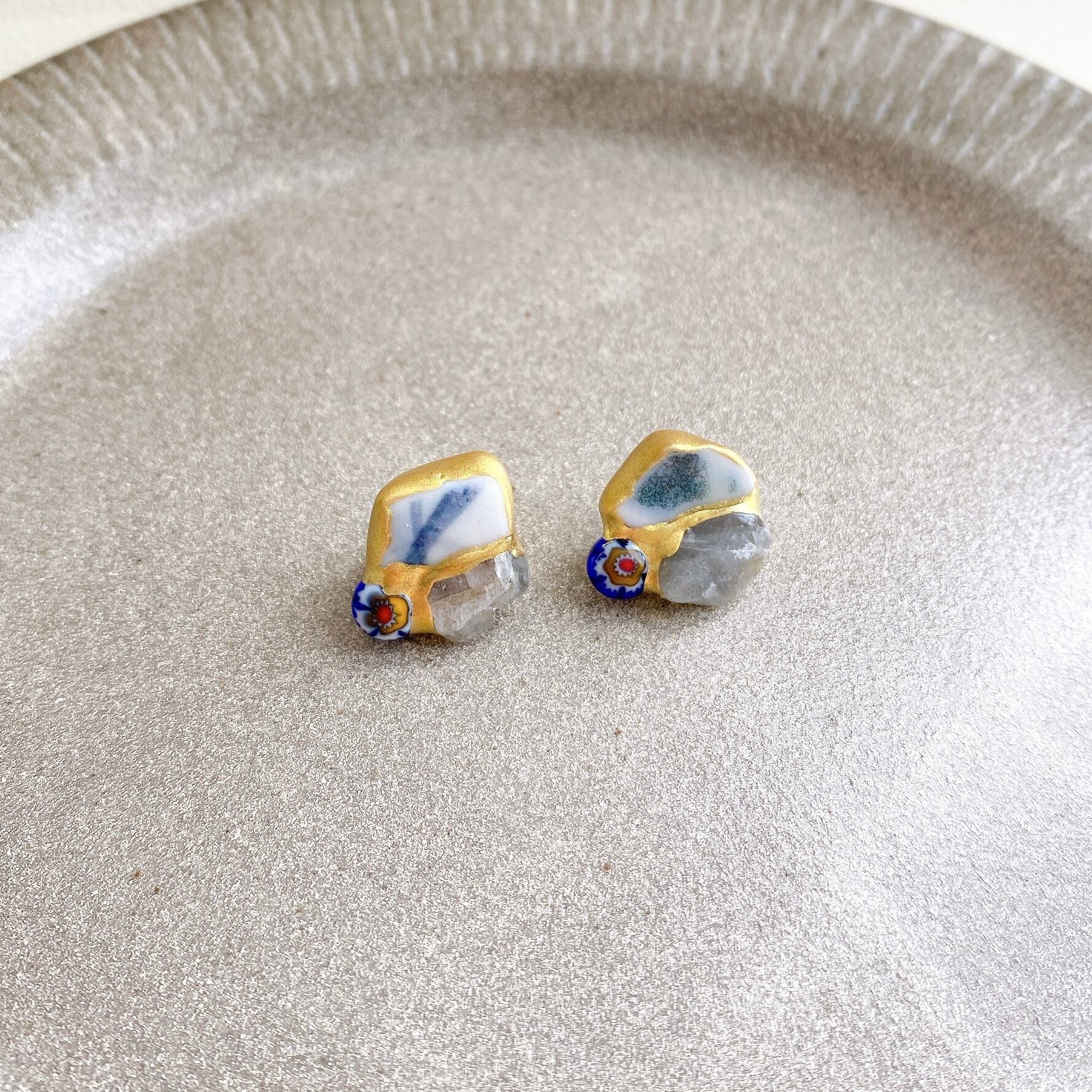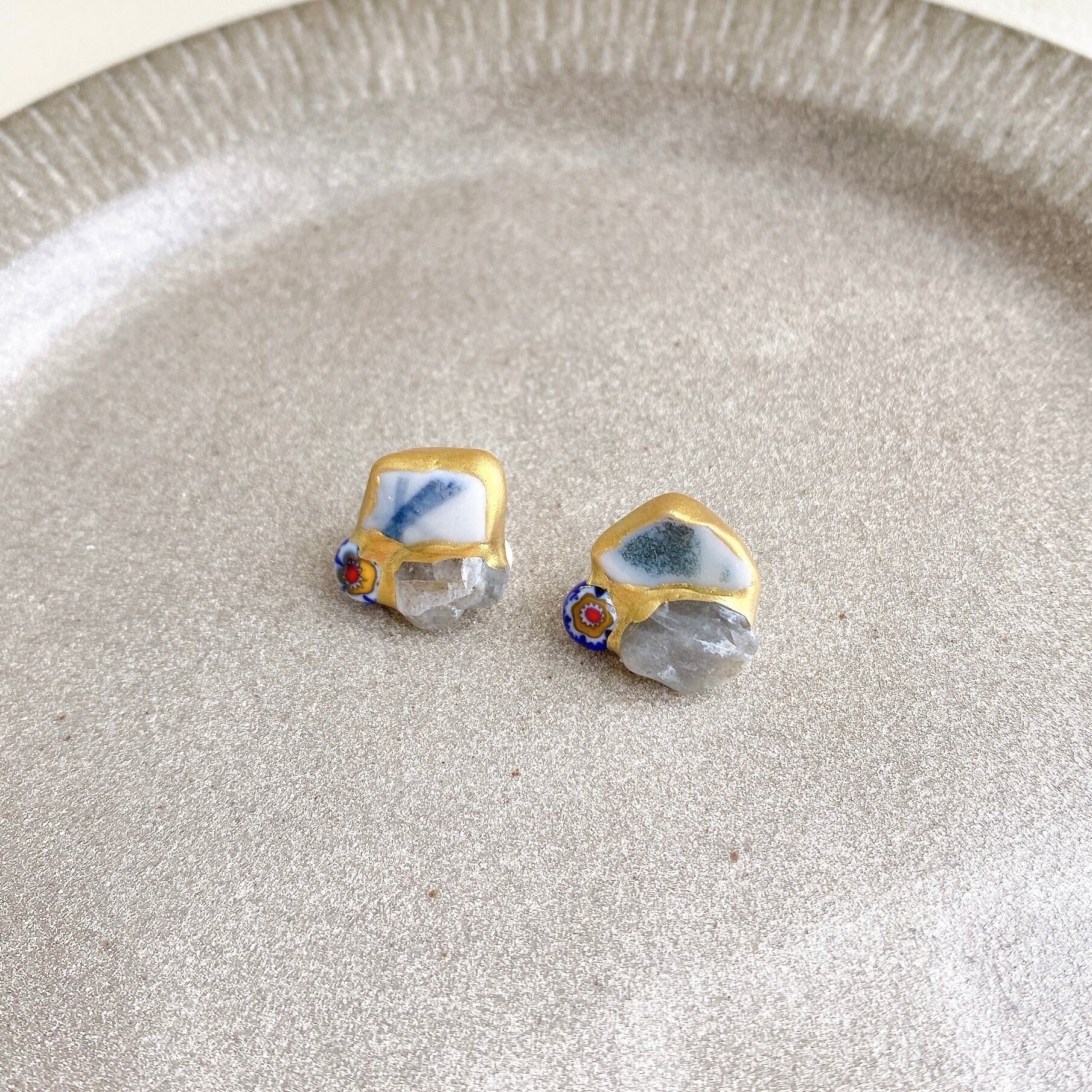 華やかな天然石と落ち着きのあるシー陶器が上品に耳元を飾ります。
